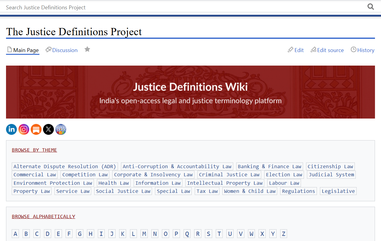 The Justice Definitions Wiki, the hosting platform for the project, is a free and open-source shared learning platform providing comprehensive, inclusive and credible legal and justice system related terminology information, co-curated by legal community in India to be used by everyone to understand the justice system in India and access justice.